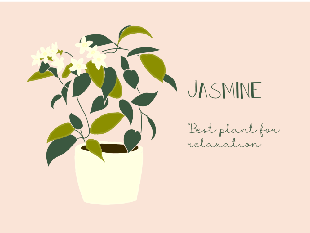 Jasmine plants have small, pretty white flowers. They give off a sweet scent, often used as an essential oil for relaxation, which studies have linked to reduced anxiety levels and improved sleep quality.